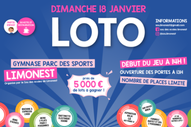LOTO organisé par le Sou des Ecoles Evènement associatif Lieu Parc des Sports Heure 13h00 – 23h59 18 janvier