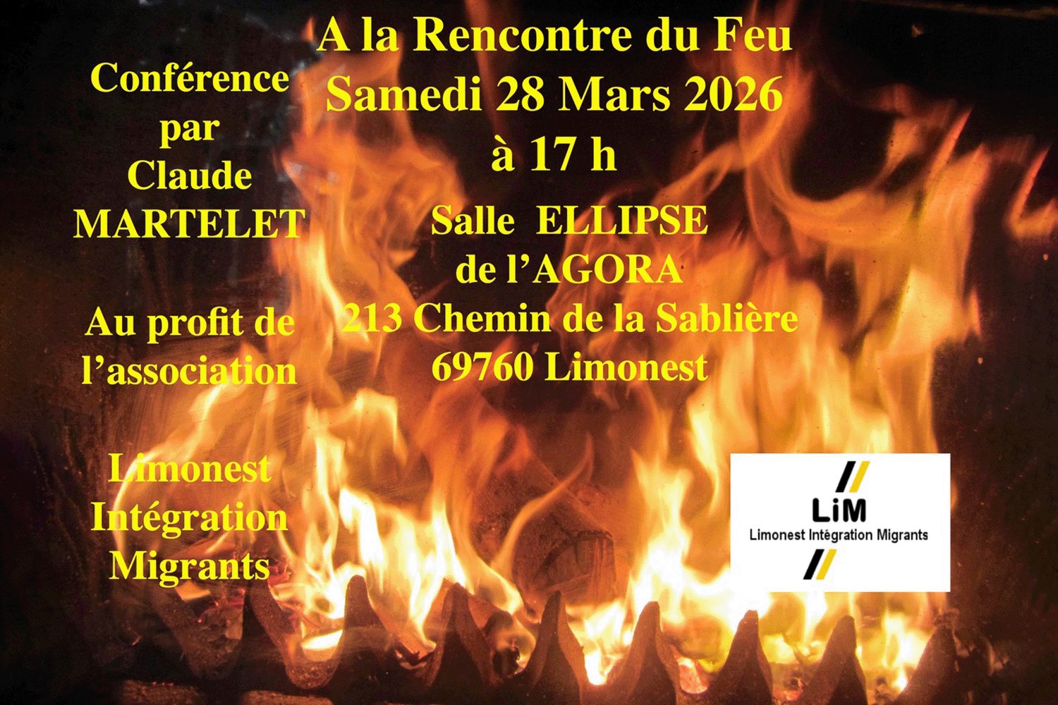 Une conférence, intitulée ” A la rencontre du Feu ” sera présentée à la salle ELLIPSE de L’AGORA (213 Chemin de la Sablière 69760 Limonest) le Samedi 28 Mars 2026 à 17h par Claude MARTELET, au profit de l’association Limonest Intégration Migrants
