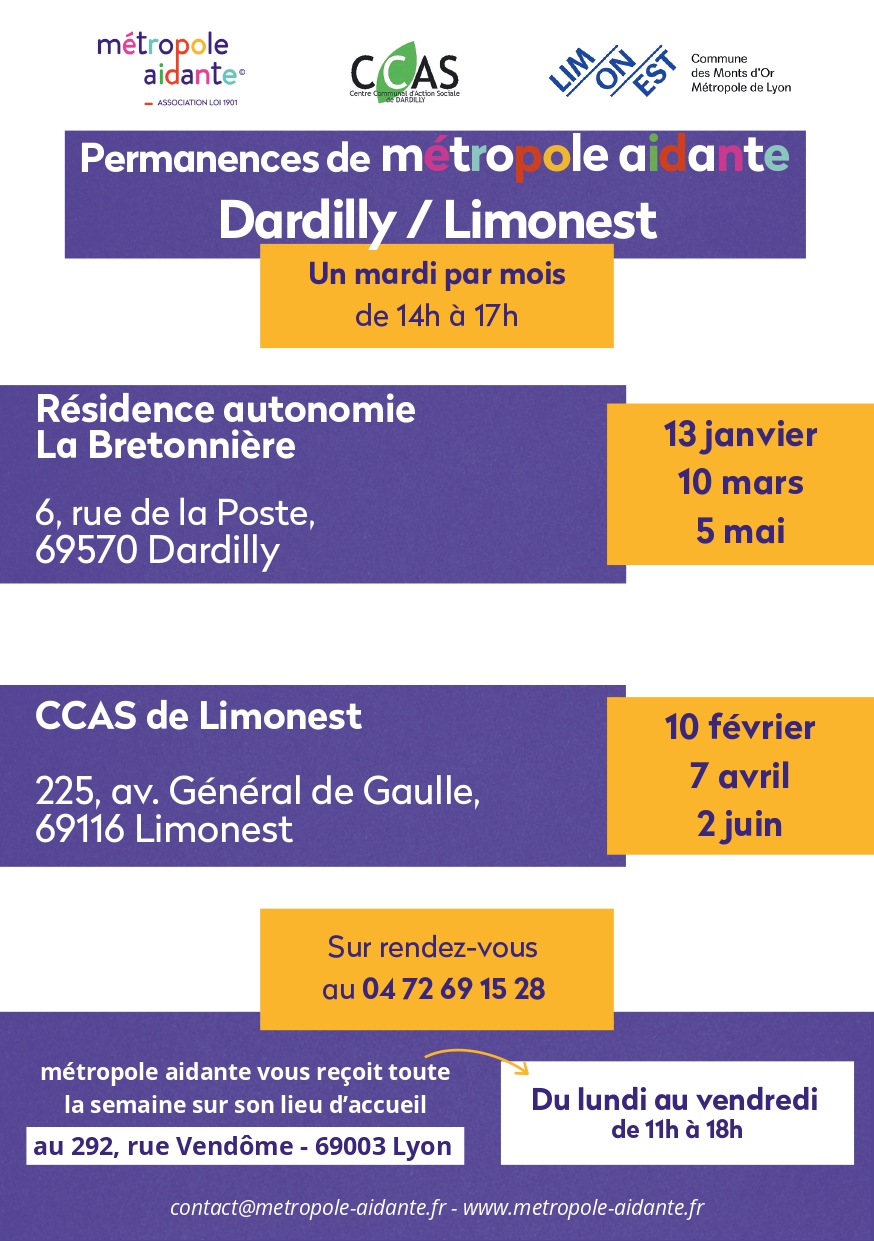 Ce dispositif propose des permanences, en alternance entre Limonest et Dardilly, pour informer, orienter et accompagner les aidants quelle que soit la situation de l’aidé (maladie, handicap ou âge).