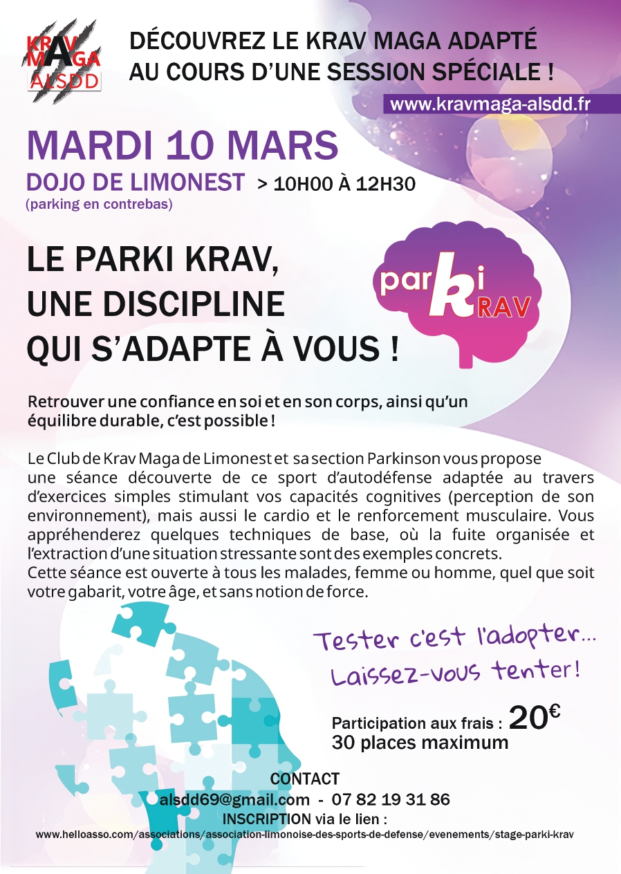 Initiation au Krav-maga pour les personnes atteintes de la maladie de Parkinson, organisée par l’ALSDD à Limonest, le Mardi 10 Mars 2026, de 10h00 à 12h30.